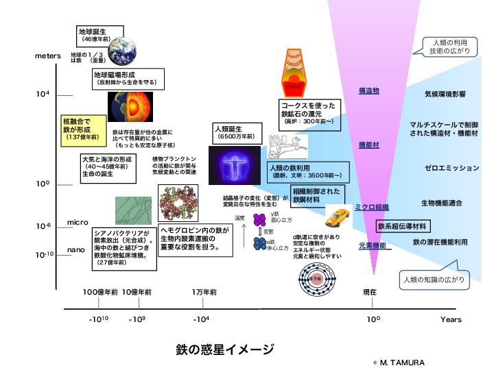 地球の重量の1/3 は鉄であり,鉄が磁場を形成し有害な宇宙からの放射線を退け,生物が地表面で暮らすことができる.血液中のヘモグロビンは鉄を中心とした構造であり,酸素を体の隅々に運ぶ.人類の経済や産業は鉄鋼の強度を活かした道具や建築物を利用することで発展してきた.