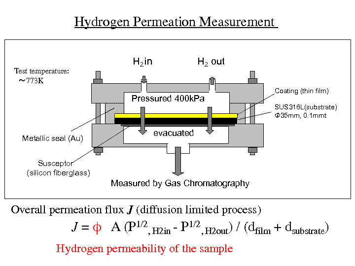 様々な材料の水素透過率は、水素用材料特性の基本であり、最初に評価すべきものです。しかし、水素用材料として使用されているSUS316などの金属材料及びその表面処理した材料の水素透過率は一般的には低く、正確な評価が難しいのが現状です。長年にわたる水素用材料の水素透過率評価研究の経験から、JISK7126の差圧法による測定法が最も有効であることがわかっています。