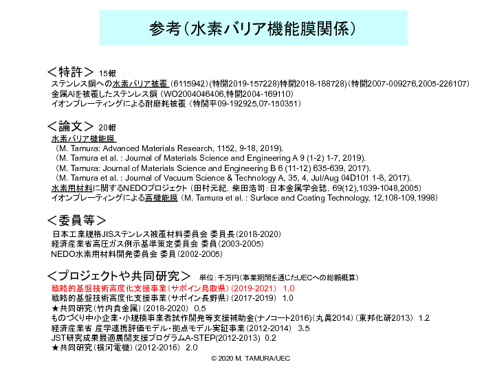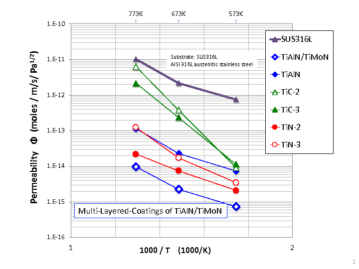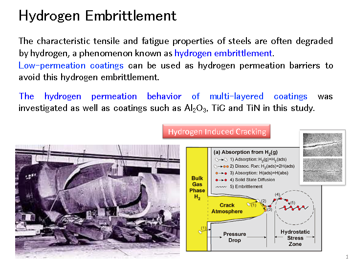 金属材料の水素環境脆化防止に、水素バリア機能膜が有効です。数ミクロンの緻密膜で水素透過率を数桁低くすることで、材料の安全性や汎用性を高めます。これまで、窒化膜、酸化膜、DLCなどの皮膜種の違い、皮膜の微細構造などの影響などを研究してきました。これらは、数々の国際会議や論文に発表してきました。
